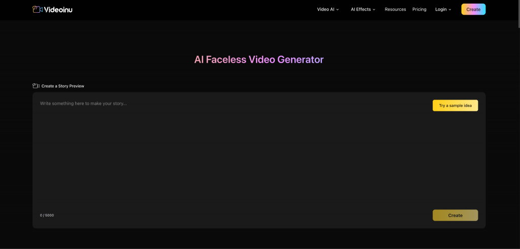 Videoinu’s AI Story Video Generator page says the tool turns written stories or scripts into structured, story-driven videos and emphasizes scene sequencing over single clips. Even if your video is not a “story” in the usual sense, this scene-based method still works better for faceless content.